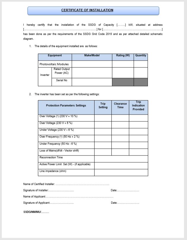 Applicant/installer to submit duly signed certificate (as shown below), with the Company's header and seal, to the CEB. The MSDG installation shall be certified by a Registered Professional Engineer (CRPE Mauritius).